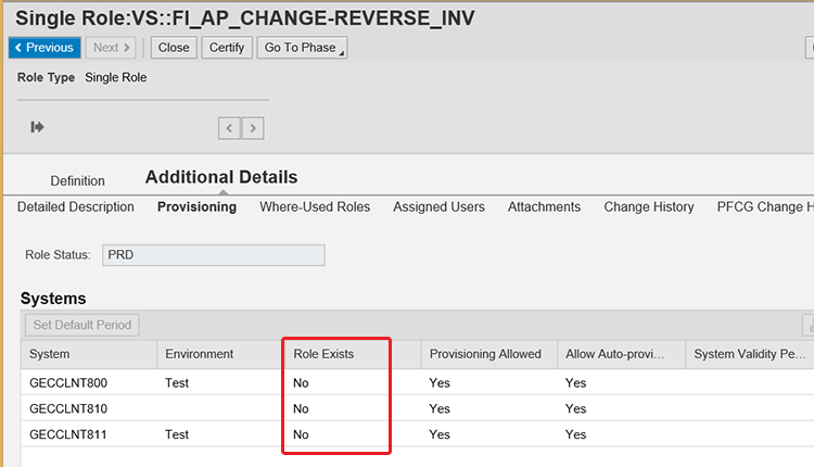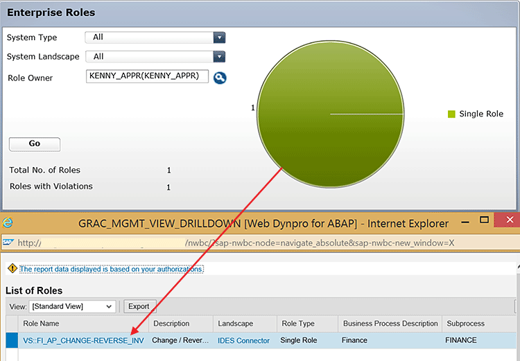 Figures 34 and 35 show the confirmation of a deleted role (VS::FI_AP_CHANGE-REVERSE_INV in my example) in the back-end system that still exists in the role library dashboard report (Figure 36) in the SAP Access Control system.