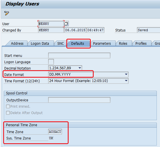 This display in Figure 37 is a reflection of the user-specific personalization that is maintained in the Defaults tab (Date Format field) in transaction SU01 (Figure 38) where the date format is set to DD.MM.YYYY and the time zone is set to AUSACT. If no user default is maintained for a user, then the information is presented in the time zone of the SAP Access Control server – Sys. Time Zone field.