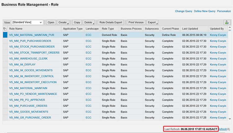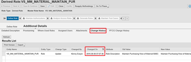 I maintained the role VS_MM_MATERIAL_MAINTAIN_PUR (for example, I changed the name) almost immediately while I had the role maintenance screen open. The Changed On column shown in Figure 40 is reported in the time zone of the SAP Access Control system, which is 07:07 UK. This is 10 hours apart, the same as the Australian time zone is to the UK time zone.