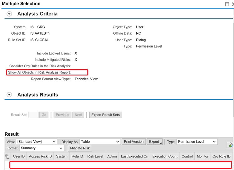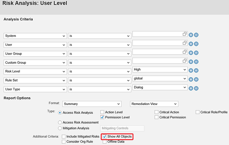 Trick: The behavior of the system as it relates to the risk analysis screen when a risk is not found for objects is controlled by the risk analysis configuration parameter 1036 (Show All Objects). If this parameter is set to YES, you get the message No Violations when no risk violation exists for objects with the selection criteria defined. If this configuration parameter is set to No, you get a blank screen. This should not be perceived as that the risk violation engine is not working correctly. This parameter can also be manually activated or deactivated on the risk analysis screen by checking or unchecking the Show All Objects check box in the selection criteria section as shown in Figure 41.