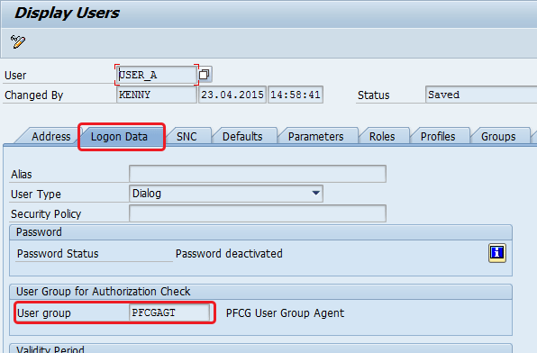 This display in Figure 37 is a reflection of the user-specific personalization that is maintained in the Defaults tab (Date Format field) in transaction SU01 (Figure 38) where the date format is set to DD.MM.YYYY and the time zone is set to AUSACT. If no user default is maintained for a user, then the information is presented in the time zone of the SAP Access Control server – Sys. Time Zone field.