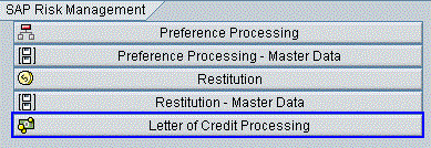 The letter of credit processing service uses the data from the SAP feeder system (SAP ERP Central Component). It is integrated with the order-to-cash (in sales and distribution) and procure-to-pay scenarios (in materials management). This is applicable for both importing and exporting scenarios. Letter of credit functionality is a part of the Risk Management module in SAP BusinessObjects Global Trade Services.