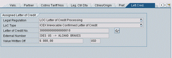 Now go back to view the corresponding customs document assigned to the document from the feeder system. You can see all the related documents created in the feeder system here. All details relevant to the letter of credit process are in the Lett.Cred. tab (Figure 7).