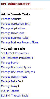 Once in BPC Administration review, go to the navigation pane on the right and select each individual option to obtain the desired information (Figure 7).