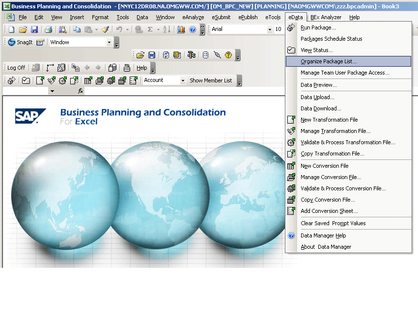 You can review information on data packages, input schedules, and reports within the client interaction area via Excel. After you log on to SAP BusinessObjects Planning and Consolidation via Excel, select the relevant appset and application. Select eData > Organize Package List… (Figure 8). Then select relevant folders as shown in Figure 9.