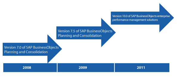 The new version of SAP Business Objects Planning and Consolidation has been integrated as part of a complete suite of tools called version 10.0 of SAP BusinessObjects enterprise performance management (SAP BusinessObjects EPM) solutions. This suite was released in May 2011 for Ramp-Up participants only. It includes the latest versions of the following products: