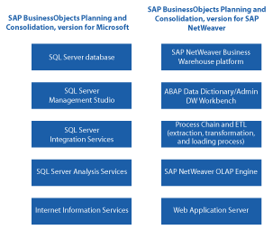 Figure 7 is just an approximation in objects and behaviors. For example, SAP BusinessObjects Planning and Consolidation, version for Microsoft uses SQL Server 2005 or 2008 and SAP BusinessObjects Planning and Consolidation, version for SAP NetWeaver uses SAP NetWeaver BW to perform ETL operations. SAP BusinessObjects Planning and Consolidation, version for Microsoft uses SSIS in comparison with process chains in SAP BusinessObjects Planning and Consolidation, version for SAP NetWeaver.