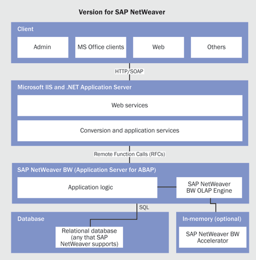The third tier of the architecture is the Microsoft IIS and .NET Application Server tier. Within the version for SAP NetWeaver, this tier only performs a few services, such as XML conversion and hosting Web services. Compared to the version for the Microsoft platform, this tier needs significantly less hardware because the majority of the processing resides in the SAP NetWeaver BW (Application Server for ABAP) tier.