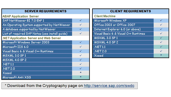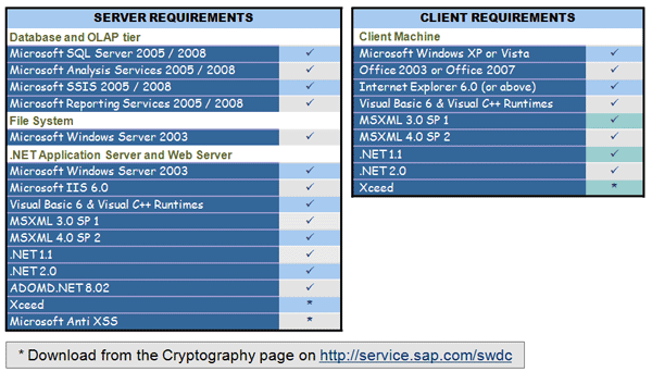 Finally, on the client tier, the main requirements are for Windows Versions (XP or Vista) and Microsoft Office versions 2003 or 2007 (Microsoft Vista support is undergoing testing at the time the article was written, and therefore was omitted from Figure 4). There are also some additional prerequisites for the client, as listed in Figure 4.