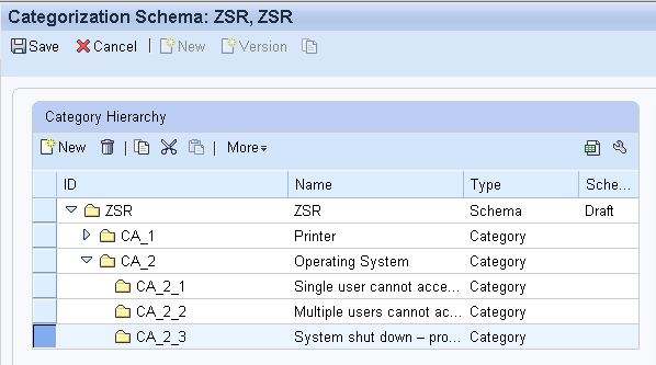 After the Catalog Categories are made available for the transaction type, the Categorization Schemas have to be filled out and activated. Additionally the service products have to be added to the according categories to determine SLA profiles.