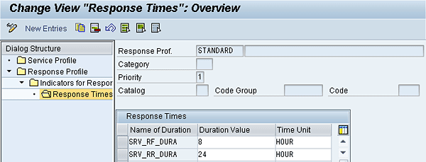The Response Times that are calculated with the service profile are shown in Figure 3, which represents the response profile. In this case the response duration is based on the priority. For a Priority 1 service request, the SRV_RF_DURA duration (usually the response duration until first reaction) is set to eight hours and the SRV_RR_DURA (usually the response duration until service end) is set to 24 hours.