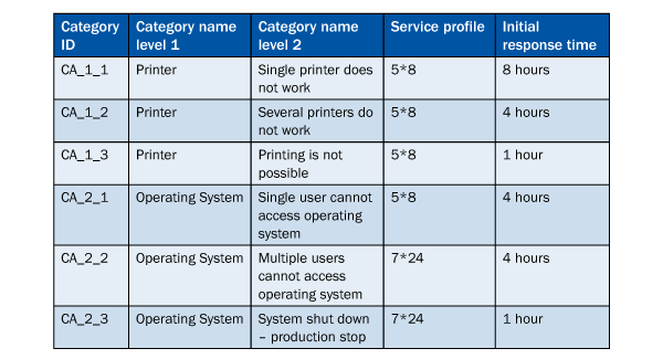 You can use multilevel categorization to extend this functionality. You can set up several categorization schemas for the service request, each with categories and subcategories. With the help of service products this allows you, for instance, to create different SLA profiles for diverse types of customer issues. A company-wide system failure requires a much faster response than a single printer jamming, and multilevel categorization gives you the tools to determine different service and response profiles in each case. Three possible use cases for using multilevel categorization in terms of SLA determination are described below, as well as the actual configuration steps to apply them.