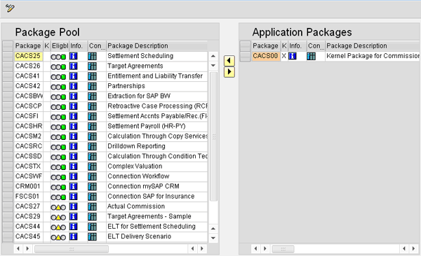 Select the packages you want to use from the Package Pool on the left side of the screen. The information button provides more information on each of the packages. To implement the functionality, in SAP ECC follow IMG menu path Incentive and Commissions Management > Application administration > Generate commission application.