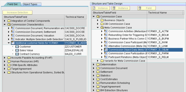 To enhance the delivered structures, SAP CRM configuration provides a node that allows you to add fields to the structure CRMT_ICM_SALES_USRFIELD_OBJ. You can perform a similar adjustment using structure CACS_S_CRM_SALES_USRFIELD_OBJ. You can access these structures from the IMG under Incentive and Commissions Management > ICM general settings and CRM general settings > Maintain Fields for Customer Enhancement of Transfer. For example, a certain sales order type triggers additional commission. Including the sales order type field allows you to pass information from the CRM sales order type to the ICM calculation setting.