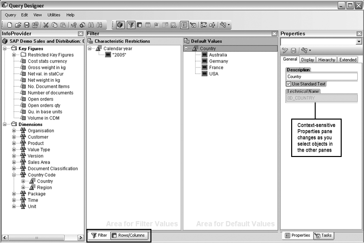 The Properties window is also new. When you click on objects in the other panes, the Properties frame changes and displays the options available to you for those objects. The center pane toggles between the Filter or Rows/Columns by clicking on the buttons at the bottom of the pane, highlighted in Figure 7. Characteristic Restrictions in the Filter section work the same as they do in BW 3.x — they completely restrict the data available to the user.