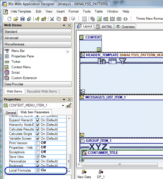 While in the edit mode for your Web template, choose the CONTEXT_MENU_1 Web item. This Web item represents the options and the menu that appear when you right- click in a query when running Web Analyzer (Figure 1). In this menu, the feature is available to the end user. The CONTEXT_MENU_1 Web item includes an option to turn on the ad hoc formula functionality. You can find this in the lower-left corner in the Properties area. The option is labeled Local Formulas. You can turn on this option by changing it to the on status. Once this option is turned on from the context menu, when the user right-clicks on the report in Web Analyzer, the end user sees a new option called Formulas. End users can then use the option to add their own ad hoc formulas to the query they are running.