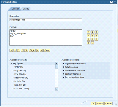 In this example, I am creating a new formula called Percentage Filled. This is the percentage of the order quantity associated with the original order quantity. I set up the formula by choosing the key figure value order quantity and using the %_A (percentage share) and the key figure original order quantity. I added a description in the Description field. This is what the end user sees as the description of the key figure when running the query.