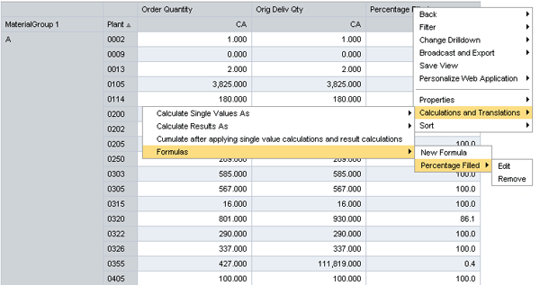 Because of the limitation of the Boolean functionality, you should only consider ad hoc formulas for performing mathematical functions on existing key figure values. They do have the advantage of acting like other key figures and can be saved as a favorite so the saved ad hoc formula can be used over and over again (Figure 4). The Percentage Filled key figure is shown in the query. This acts and looks like the other key figures in the query and can be sorted, totaled, scaled, or hidden just like any other key figure.