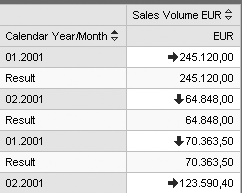 These settings alter the way the system displays the exceptions. SAP NetWeaver BI 7.0 offers many options for visualizing exceptions via the Web. In previous releases of SAP BW and in BEx Web Analyzer, you could highlight exceptions only with colors. In BEx Web Analyzer in SAP NetWeaver BI 7.0, you can use symbols instead, as Figure 2 shows. In this example, the up arrows indicate good exceptions (higher than the expected sales volume). The down arrows indicate bad exceptions (lower than the expected sales volume). The right arrows indicate marginal exceptions (sales that are close to what you expected but trending badly).