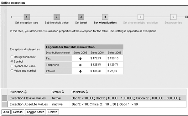 For this first method, access the exception wizard in the BEx Web Analyzer Settings tab, located on the right side of the Web Analyzer. In step 4 of the wizard, click on the Add button for the exception Web item and select Symbol for the visualization (Figure 3).