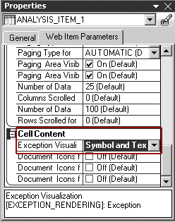 The second option to configure symbols is using a setting on the Analysis Web item, which you use to build the Web template in Web AD. The item’s Data Provider must obtain data from a query with exceptions to use this method. Figure 4 shows the Analysis Web item properties for ANALYSIS_ITEM_1. You can select symbols, colors, or other options during the design of the BEx Web template when using Analysis Web items.