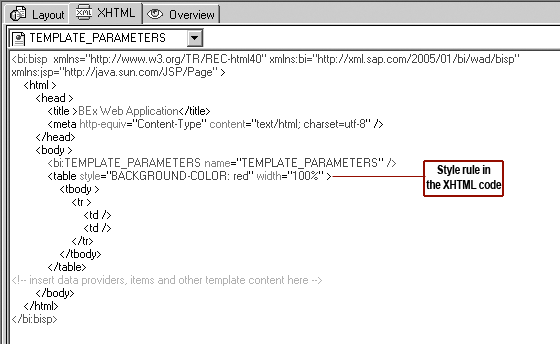 In this step, you use style commands inside your BEx Web template to override the defaulted look and feel of the Web items or other HTML tags. The direct access to the code provides complete access to the vast formatting options in standard CSS. You can also add watermarks, make objects blink, or change more basic formatting features.