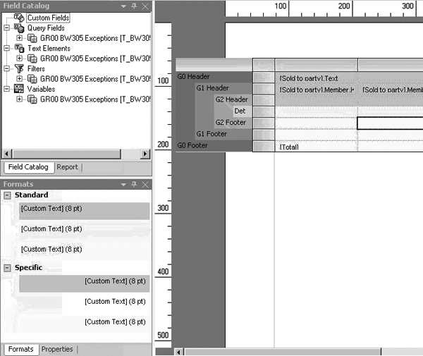 Figure 7 shows the design screen for BEx Report. Access this screen by following menu path Start>Programs> Business Explorer>BEx Report Designer. This GUI allows you to format columns, cells, background colors, and totals. You can also add other features to improve the look of the report.