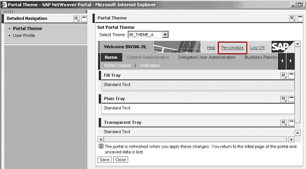 As I mentioned, portal themes use CSS as their underlying technology. Figure 8 shows a user employing BI_THEME_A. By clicking on the Personalize link, you can select a theme from the list. This allows you to easily change the look and feel of your portal experience.