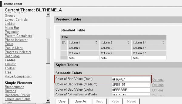 My focus is more specifically on how to change themes to affect the format of SAP NetWeaver BI objects. Figure 9 shows the theme editor and the Analysis Web item (e.g., tables). Portal administrators use this theme editor to change the underlying style sheet. The administrators normally start with an SAP-supplied theme, copy it, and then change the copy. In this example, I show how the portal administrator can change the color for a given exception, which in this case is a bad exception.