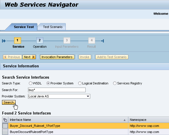 Next open your Web browser and call the Web service navigator. The URL for the Web service navigator is https://<server>:<port>/wsnavigator. On the first screen, select Provider System and enter buy* as the search criterion. Click the Search button (Figure 10).