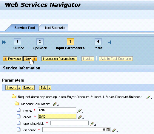 In the table of found service interfaces, select your rule set (Buyer_Discount_Ruleset_1PortType) and click the next two Next buttons to reach the dialog for entering the input parameters. Fill the fields as shown in Figure 11 and click the Next button to call the rule set. The result you receive should be similar to what is shown in Figure 12.