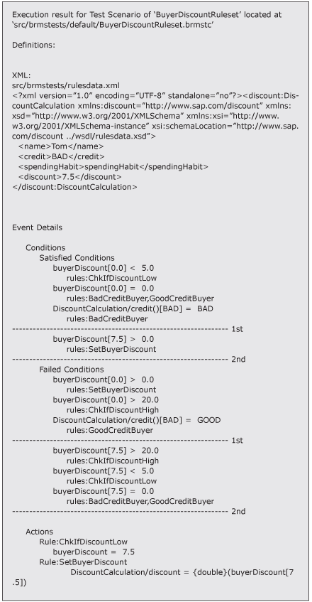 in the upper-right corner of the Test Scenario editor in Figure 2. As a result, a new tab named Rules Testing Console opens beneath the Test Scenario editor. It contains the output shown in Figure 3.