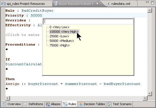 How can you ensure that, for example, the GoodCreditBuyer/BadCreditBuyer rules are always evaluated before the ChkIfDiscountLow/ChkIfDiscountHigh rules are fired? The answer: Use priorities, which you can set in the Rules Editor (Figure 5). A higher number reflects a higher priority. In my example, I’m increasing the priority of the BadCreditBuyer rule. With priorities you have the chance to influence the evaluation sequence, ensuring stability in the results you receive.