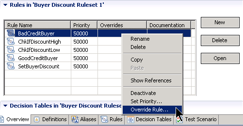 You can easily add an override on the Overview tab of your rule set. Right-click the BadCreditBuyer rule and select Override Rule… from the context menu (Figure 7).