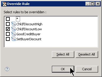 As result, a dialog opens listing all the rules you can override. The list reflects rules with a priority that is lower or equal to the priority of the selected rule (Figure 8). Select the check box in front of the rule you want to override — in my example, this is the ChkIfDiscountLow rule. The asterisk at the top of the list is a wildcard and stands for override all rules. Close the dialog by clicking the OK button and save your changes.