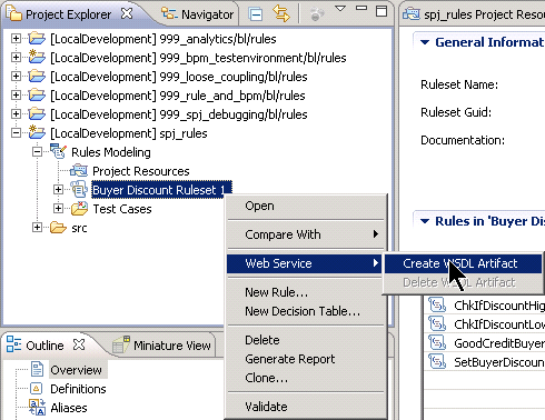 Now that you have defined the rules, you can run the rule set on your SAP NetWeaver Composition Environment (SAP NetWeaver CE) server. The most convenient way to achieve this is by calling the rule set via a Web service. With SAP NetWeaver CE 7.2, you can do this with just a few clicks. Right-click your rule set in the Project Explorer view and select Web Service > Create WSDL Artifact from the context menu (Figure 9).