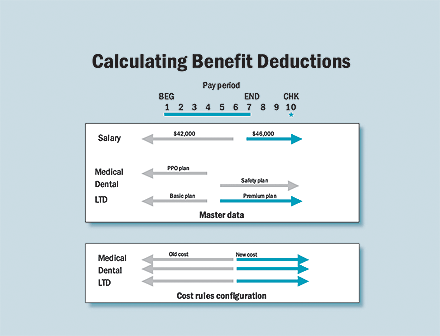You can see this difference by considering the example employee illustrated in Figure 1. This employee had a change of salary on day 7 of the pay period. There is an election for the PPO medical plan that begins before the start of the pay period but ends on day 4. There is an election for the Safety dental plan that begins on day 5 of the pay period and extends beyond the end of the pay period. The employee changed his LTD election from the basic plan to the premium plan on day 5 of the pay period. All of the plans have a change in configured costs starting on day 6 of the pay period.