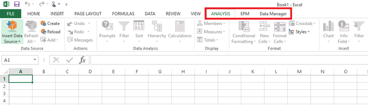 After the installation, the options ANALYSIS, EPM, and Data Manager are displayed on the Excel ribbon, as shown in Figure 2.
