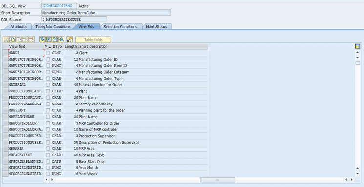 One example is the Manufacturing Order Item Cube (IPPMFGORDITEMC), which delivers information about the released production order items. You can access this view directly by executing transaction code SE11. This action displays the screen in Figure 3 in which you can see the technical details behind the Manufacturing Order Item Cube, such as the View Flds, the Table/Join Conditions, or the Selection Conditions.