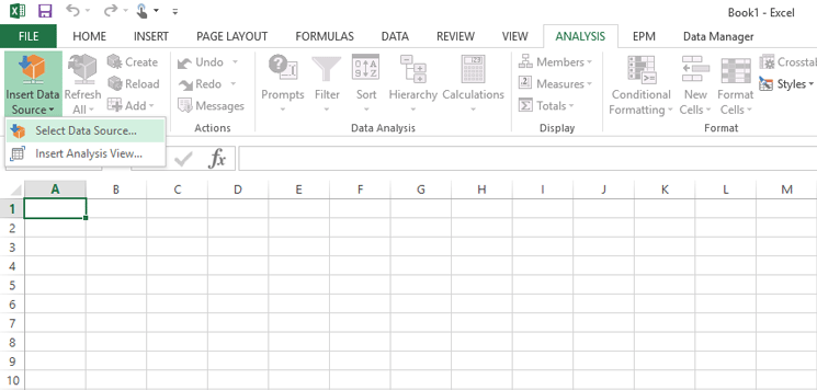 After you open Microsoft Excel and select the Analysis tab, the Insert Data Source button is available, as shown in Figure 6. Click Insert Data Source and then select the Select Data Source… option, as also shown in Figure 6.