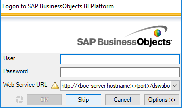 Click the Skip button in the SAP BusinessObjects logon pop-up screen shown in Figure 7, since a Web Service will not be used for the connection.