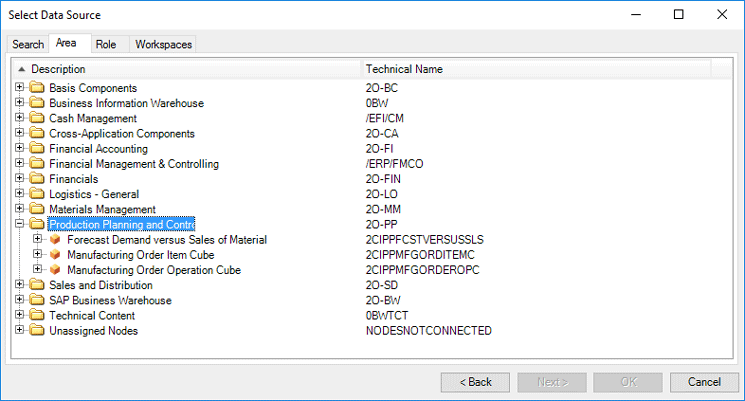 After you complete the logon, you can select the desired data source. Select the Area tab (Figure 10) to see an overview of the available data sources (CDS views) for each application area.
