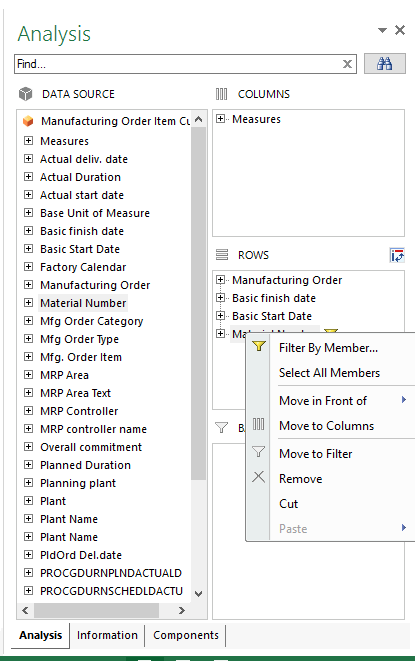 You can also drag and drop more fields to the row, such as the material number or basic start and finish dates, into the rows to see additional information on the report. You can also add a filter for any field by right-clicking the field and selecting the Filter by Member… option, as shown in Figure 13.