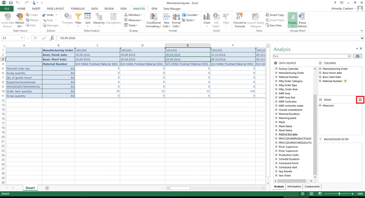 Now that you have loaded the data source into your spreadsheet, you can drag and drop the data source fields into the columns and rows under the frame Analysis to view a more detailed report. For example, Figure 12 displays the spreadsheet after you drag the field Manufacturing Order and drop it into the rows. With this step, you can stratify your data and see each order in a different row.