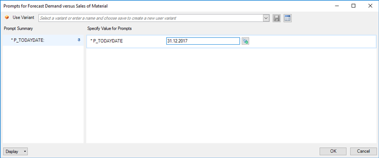 This cube reads data from the CDS view IPPFCSTVERSUSSLS and it is basically the production requirements plan (planned independent requirements). After you select this cube, a pop-up screen appears in which you can input a date. You can read the forecast requirements in the future from the database until the date entered in this pop-up, as shown in Figure 18.