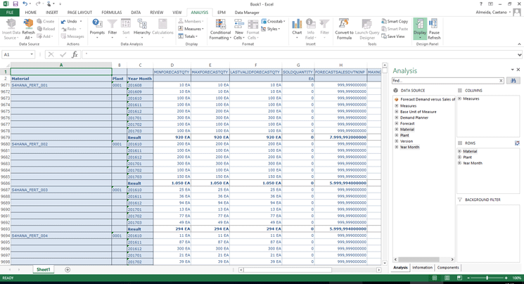 Following the same procedure that was executed to build the production order reports, you can drag and drop the Material, Plant, and Year Month fields into the columns to see the total forecast for each material and plant combination on a monthly basis. Figure 20 shows the spreadsheet after applying those changes.