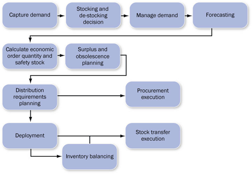 Service Parts Planning offers a variety of planning features that support this target throughout the service parts supply chain from the appearance of the demand to the delivery of the service product. The process flow in Figure 2 shows Service Parts Planning’s planning sequence for service parts, which I’ll cover in the next five sections.