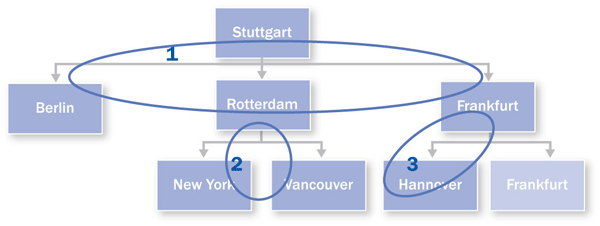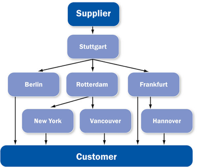 A BOD always consists of one or more entry locations and can contain parent and child locations. The entry location defines the location to which the supplier delivers the parts. The location from which the customer is served is called a customer facing location. Parent locations ship to other locations that are then called children. A virtual child is introduced for locations that ship directly to the customer and also to other locations. All data related to customers, such as forecast or safety stock, is then assigned to the virtual child. As a result, stock transfers are created from the physical to the logical location to cover the demand. Figure 3 is an example of a supply chain for a service part. This supply structure transferred in a BOD results in the distribution plan shown in Figure 4.