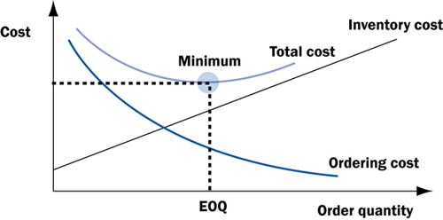 The concept of a combined determination of an EOQ and safety stock helps to optimize inventory and procurement costs plus the targeted service level. The procedure always starts with the calculation of the EOQ. It is obvious that an increasing order quantity reduces the number of purchase orders, which also means a reduction in ordering costs. At the same time, the average inventory and the related costs increase. The EOQ calculation determines the order quantity with the minimal total costs (ordering + inventory costs) as shown in Figure 6.