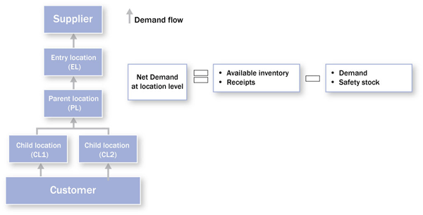 The main demand driver at the customer facing locations is the forecast. Customer orders are only relevant as demand elements when they are dated in the future. Demand for the mid-level location is mainly represented by stock transfer orders plus stock transfer order proposals to its child locations. These planned stock transfers should cover the net demand at the child locations. Demand for the entry location is also generated by stock transfer orders plus stock transfer order proposals to its child location. These proposals satisfy the net demand at the mid-level. Finally, the net demand for the entry location is covered by procurement proposals (schedule lines or purchase requisitions).
